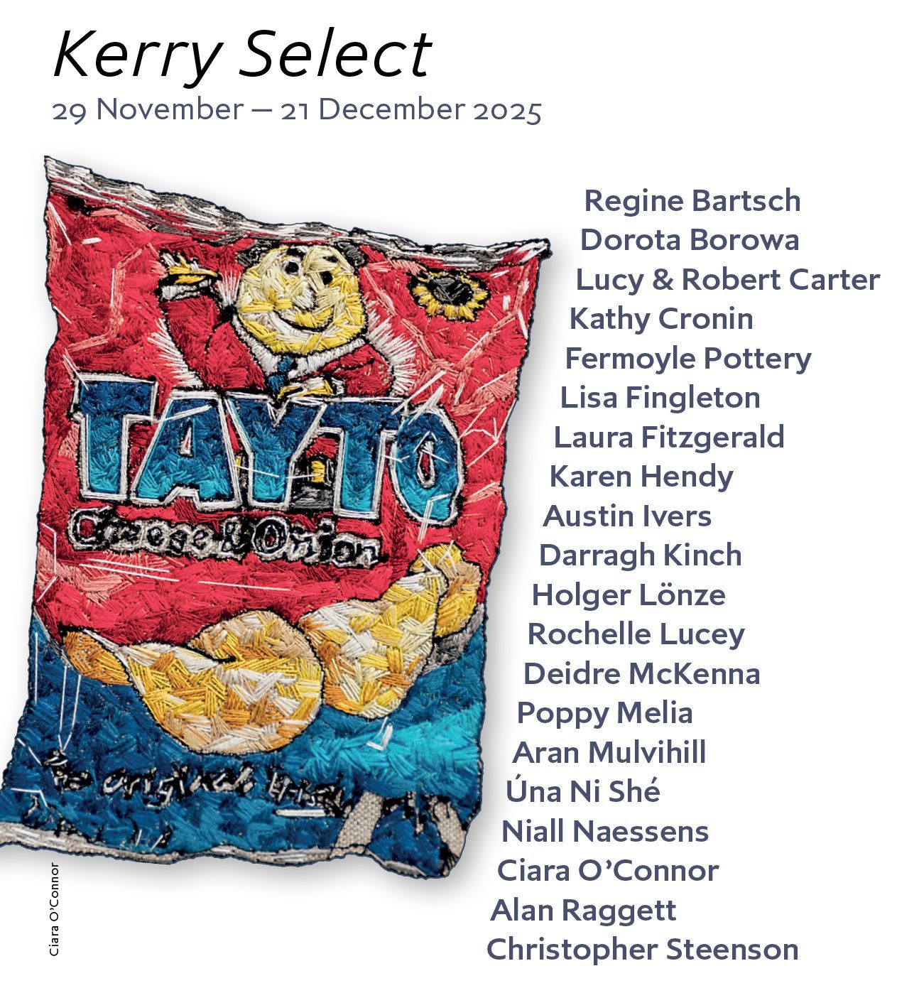 A exhibition of contemporary Kerry-based artists showing a wide range of media: Regine Bartsch, Dorota Borowa, Lucy & Robert Carter, Kathy Cronin, Fermoyle Pottery, Lisa Fingleton, Laura Fitzgerald, Karen Hendy, Austin Ivers, Darragh Kinch, Holger Lönze, Rochelle Lucey, Deirdre McKenna, Poppy Melia, Aran Mulvihill,