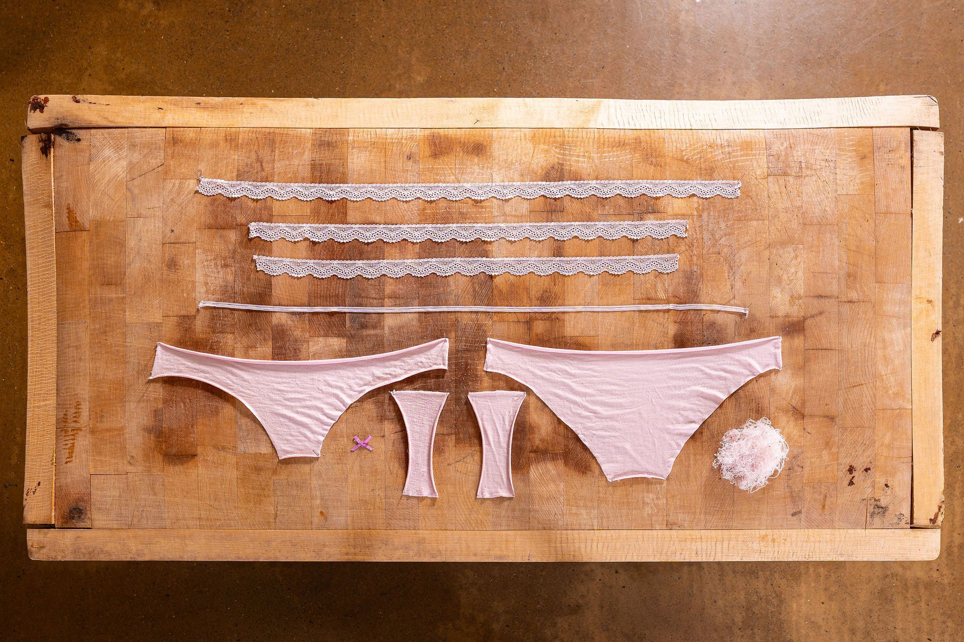 Middle Áine Ryan, Barren is Never Used for Men, 2025, butcher’s block, deconstructed women’s underwear, metal pins, h15 x w122 x d61 cm